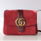 숄더백. 1970년대 아카이브에서 차용한, 새로운 컬렉션을 정의하는 더블 G 메탈 장식. 더블 거싯 및 과장된 플랫 장식. 빈티지 감성을 더하는 보르도 스웨이드와 가죽 디테일 조합. 프랑스 아를의 알리스캉 지역에 위치한 고대 로마의 공동묘지에서 펼쳐진 구찌 2019 크루즈 컬렉션에서 선보인 패션소품.